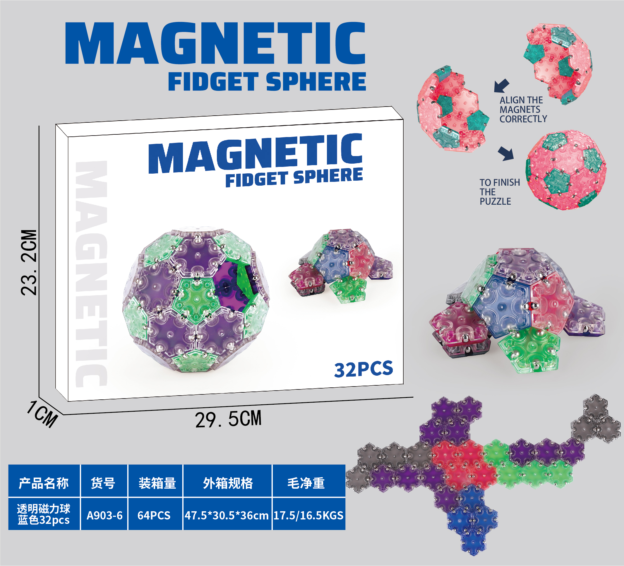 Transparent 5. Hexagon Fit Magnetic Ball 32PCS(Blue)